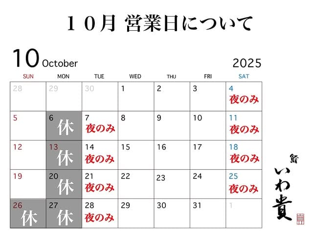 10月の営業日について